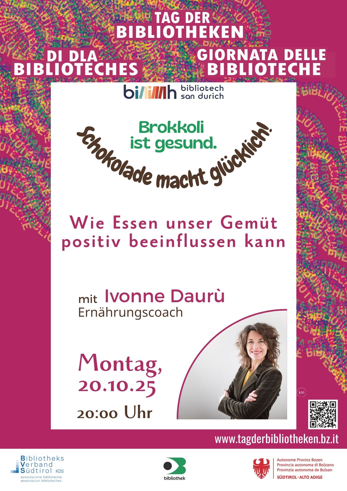 Dr. Ivonne Daurù, Ernährungscoach und Beraterin, wird uns im Rahmen ihres Vortrages den Zusammenhang zwischen Ernährung und psychischem Wohlbefinden erklären. Was können wir essen, um unser Gemüt positiv zu stimulieren? Welche Nahrungsmittel tragen zu unserer psychischen Gesundheit bei?