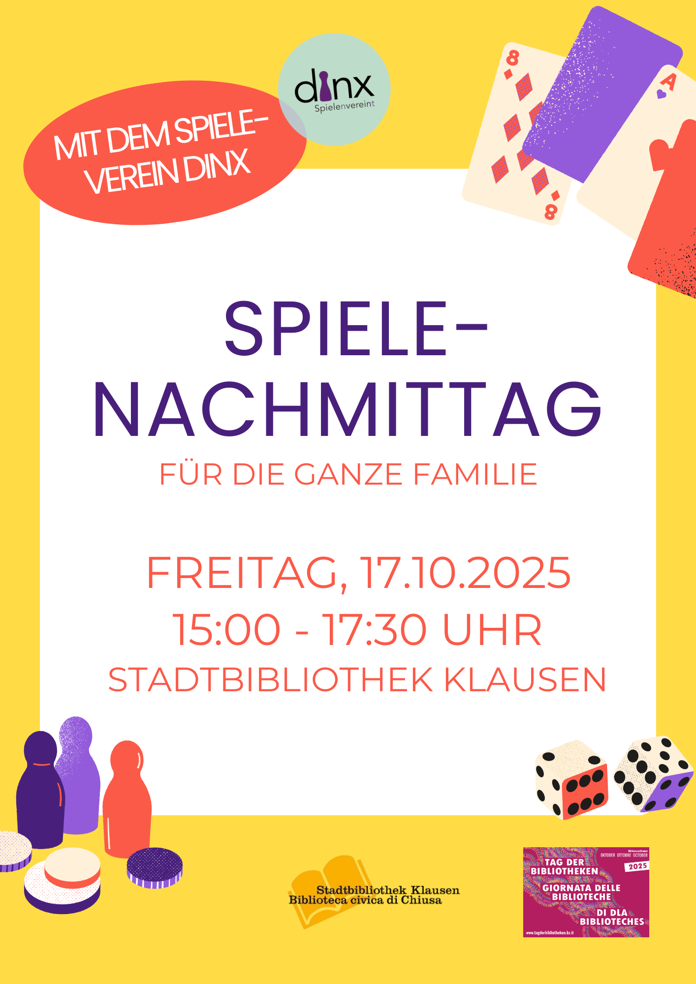 Die Stadtbibliothek Klausen lädt gemeinsam mit dem Spieleverein DINX zu einem gemütlichen Spielenachmittag ein! Familien, Kinder und Erwachsene sind herzlich willkommen, neue Spiele auszuprobieren, Klassiker wiederzuentdecken und einen unterhaltsamen Nachmittag mit Brett-, Karten- oder Gesellschaftsspielen zu verbringen.