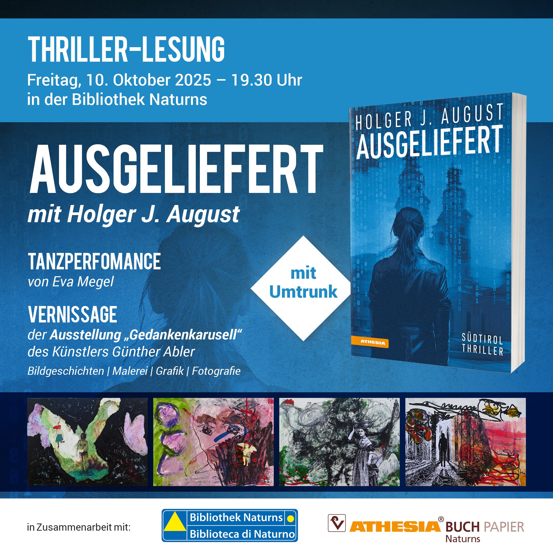 📖 Lesung Der renommierte Autor Holger J. August präsentiert seinen neuesten Südtirol-Thriller „Ausgeliefert“. Inmitten alpiner Kulisse entfaltet sich eine fesselnde Geschichte: Ein mysteriöses Tagebuch voller Drohungen. Eine Journalistin, die an ihre Grenzen stößt. Ein Stalker, der immer näher kommt. Doch wer ist hier wirklich das Opfer – und wer der Täter?